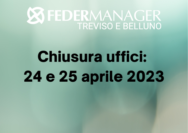 Gentili Associate e Associati, vi informiamo che i nostri uffici rimarranno chiusi il 24 aprile. Cordiali saluti Federmanager Treviso e Belluno