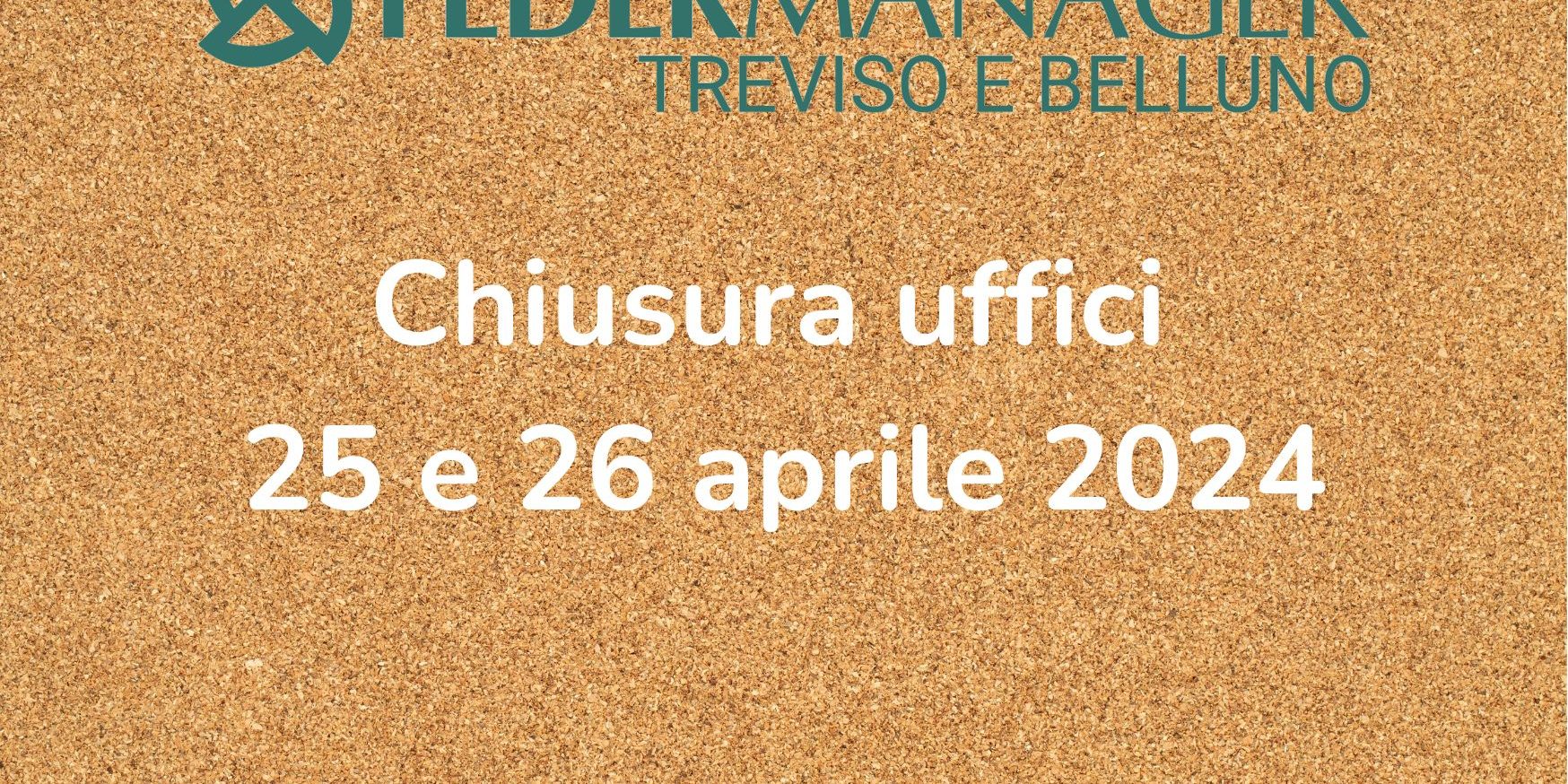 Gentili Associate e Associati, vi comunichiamo che gli uffici di Federmanager Treviso e Belluno rimarranno chiusi per le festività del 25 e 26 aprile 2024. Riapriranno regolarmente dal 29 aprile. Cordiali saluti Federmanager Treviso e Belluno Facebook Twitter LinkedIn Print WhatsAppCategoria: ComunicazioneDi redazioneAprile 19, 2024 Autore: redazione Naviga tra i postPrecedentePost precedente:CDi Manager: posizioni aperte aprile 2024SuccessivoProssimo post:Presentazione libro “Il lavoro del lavoro” di Aldo Bottini e Alberto Orioli 8 maggio 2024 ore 17.00 Notizie collegate Incontro Fasi & Assidai - Il valore del welfare sanitario per Aziende e Dirigenti. Dalle tutele Fasi al Prodotto Unico Fasi-Assidai 04 Apr 2023 Convegno Previdenza con Confindustria Veneto Est: 24 gennaio 2024 ore 17:30 08 Gen 2024 Incontro: Strategie di Acquisizione e Cessazione d'Azienda - Come cambiano alla luce dei nuovi obblighi occupazionali ex art. 47 l. 428/90 02 Ott 2023 Convegno Previdenza: interviste ai relatori 08 Feb 2024 Video Assemblea Annuale 2016 - Federmanager Treviso Belluno 06 Giu 2016 Petizione CIDA: "Salviamo il ceto medio" 07 Dic 2023